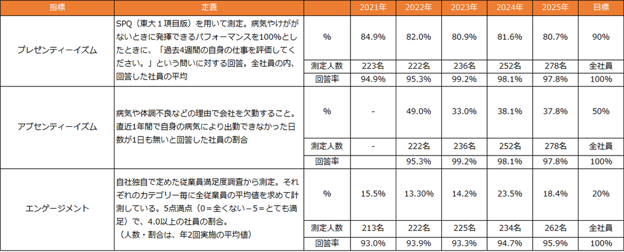 - 「活力」の側面を測るため、健康課題によるパフォーマンス低下を示すプレゼンティーイズムを90%以上と設定しました。