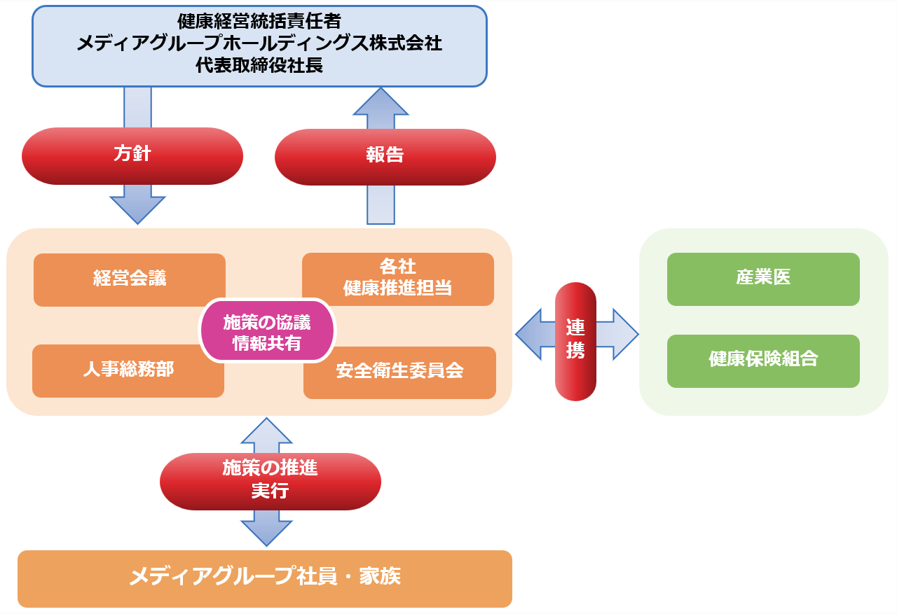 推進にあたっては、「経営会議」「人事総務部」「安全衛生委員会」「各社の健康推進担当」等、組織横断的に役割分担し、施策を検討・実施していきます。